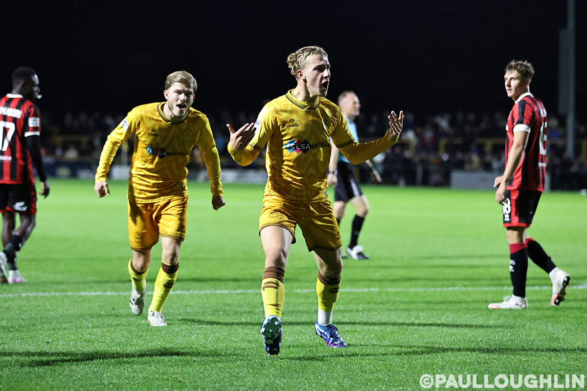 A lovely team move saw Brandon Njoku get the ball under control before spreading it out to Dillon De Silva who’s cross towards the back post was picked up by Aaron Jones, who kept the chance alive by sending the ball back into the middle. Ashley Nadesan tried a first-time volley which was blocked into the path of Bell, who arrowed a thunderous effort off the underside of the crossbar and into the top corner to level things up against the Glovers.