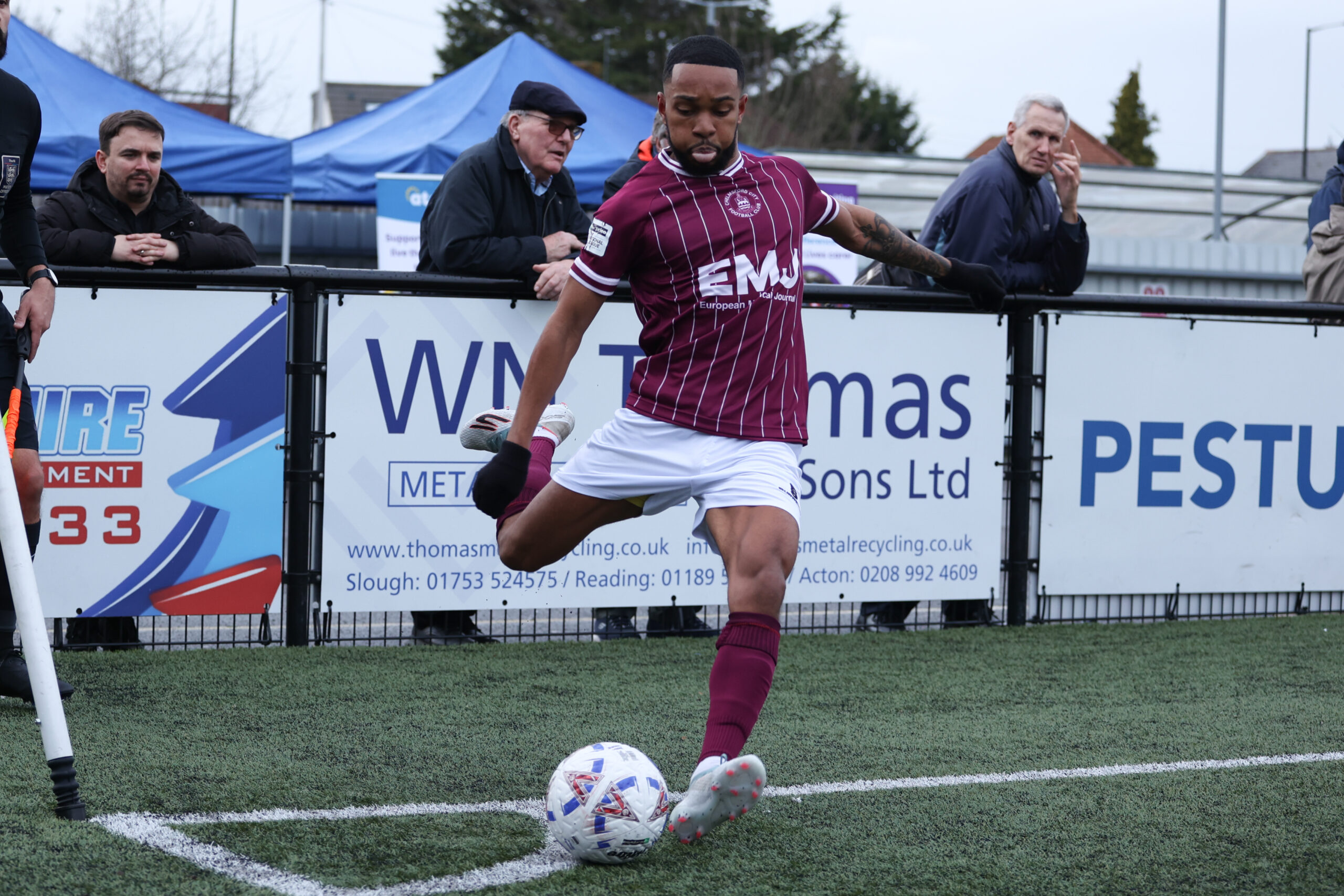 The Bermudan followed it up by going close to an opener against Slough Town, slamming a shot into the box that brought cries for a handball, before being replaced at half time with the ten-men Clarets down 3-0; the Essex-side going on to fall to a 5-0 defeat at Arbour Park.