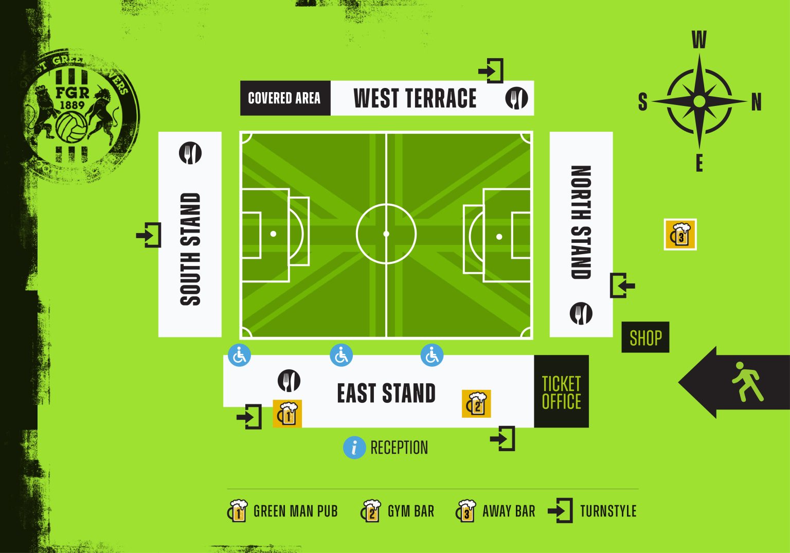 Please note the Green Man pub and the Gym Bar are for home fans only.