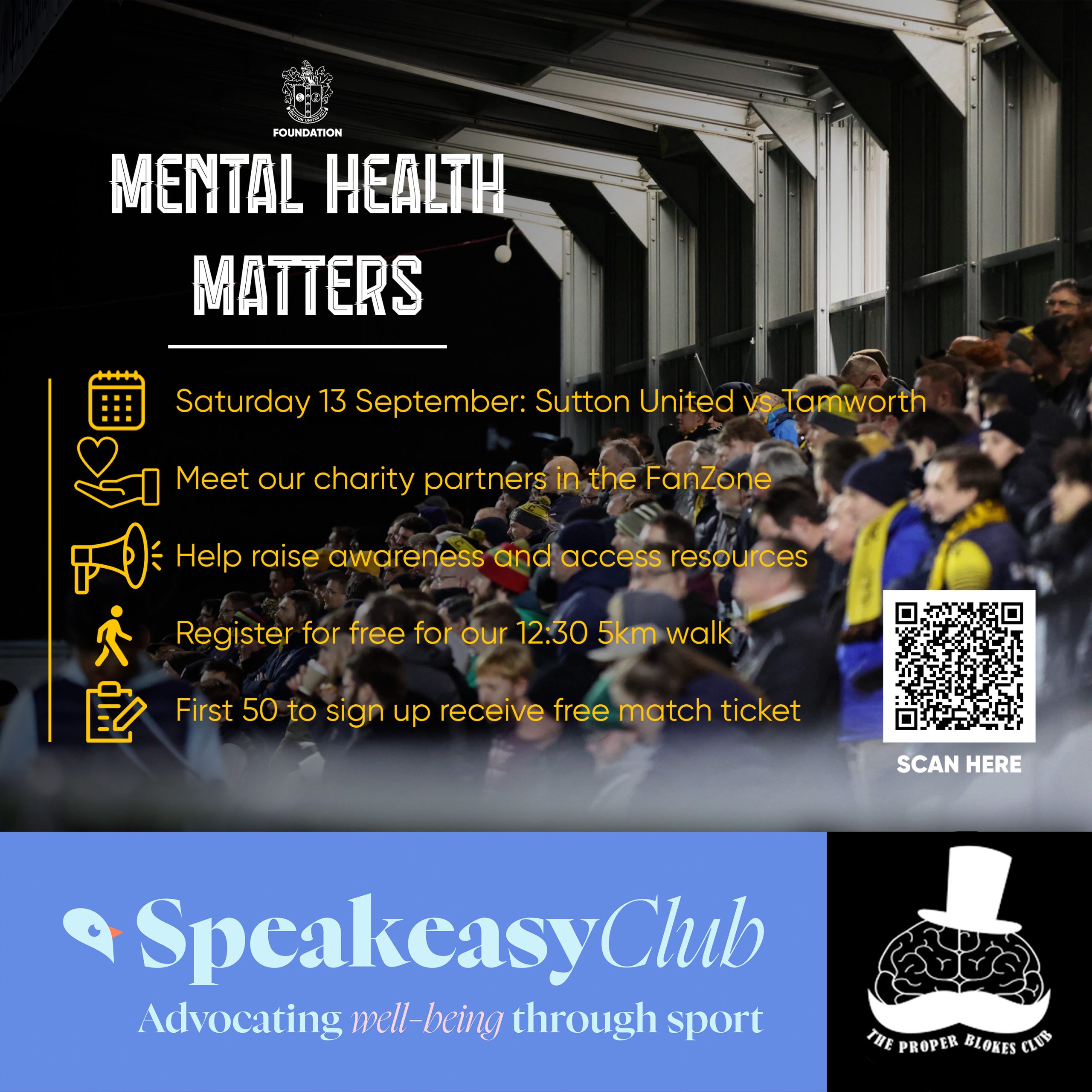 To mark this year’s World Suicide Prevention Day (Wednesday, 10th September), the SUFC Foundation, along with our charity partners The Speakeasy Club and The Proper Blokes Club, are hosting a 5km walk ahead of our home game against Tamworth (Saturday, 13th September), aiming to raise awareness around mental health and encourage open conversations through sport.