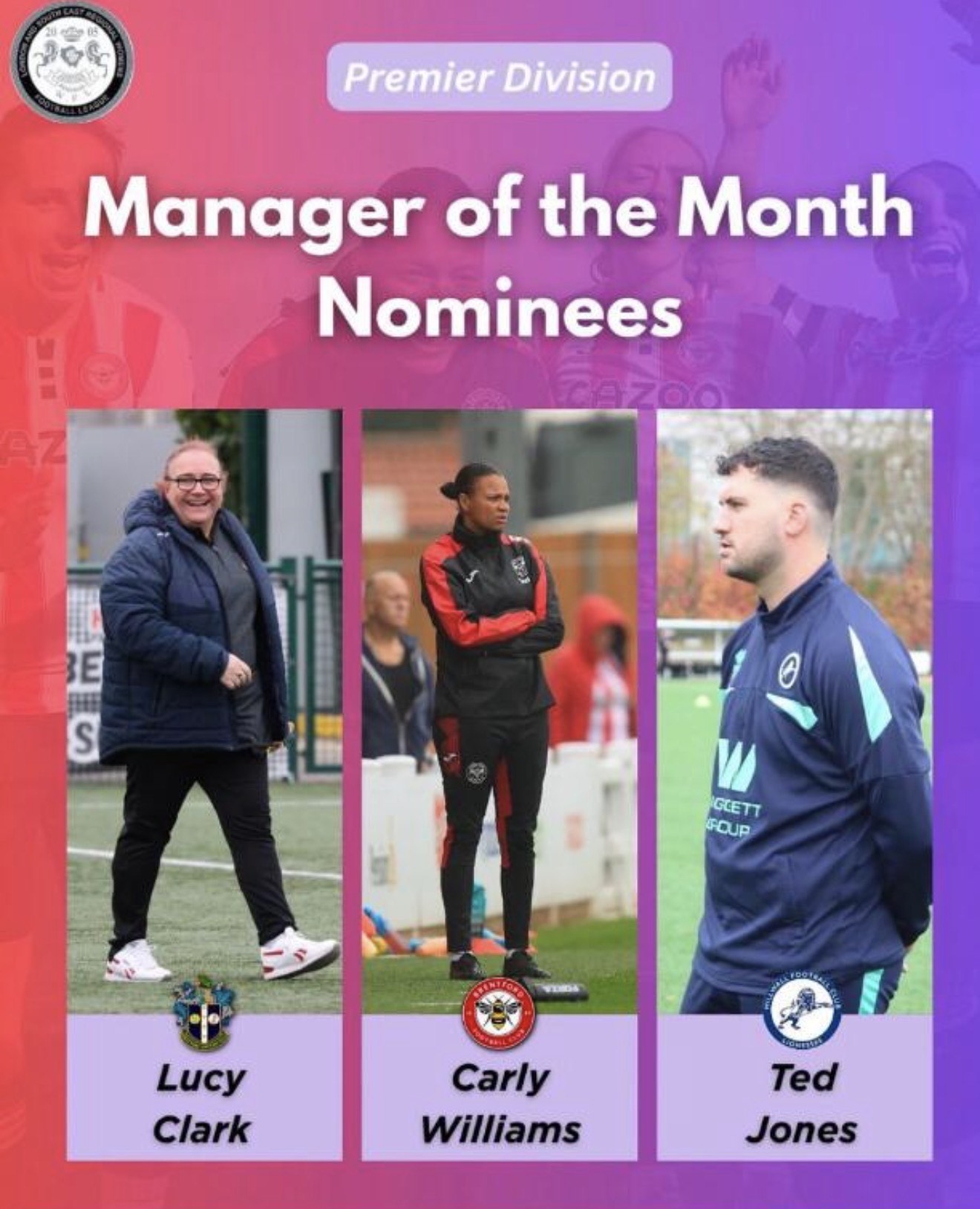 Sutton United Women Manager Lucy Clark has been nominated for the London & South East Regional Football League Premier Division Manager of the Month award.