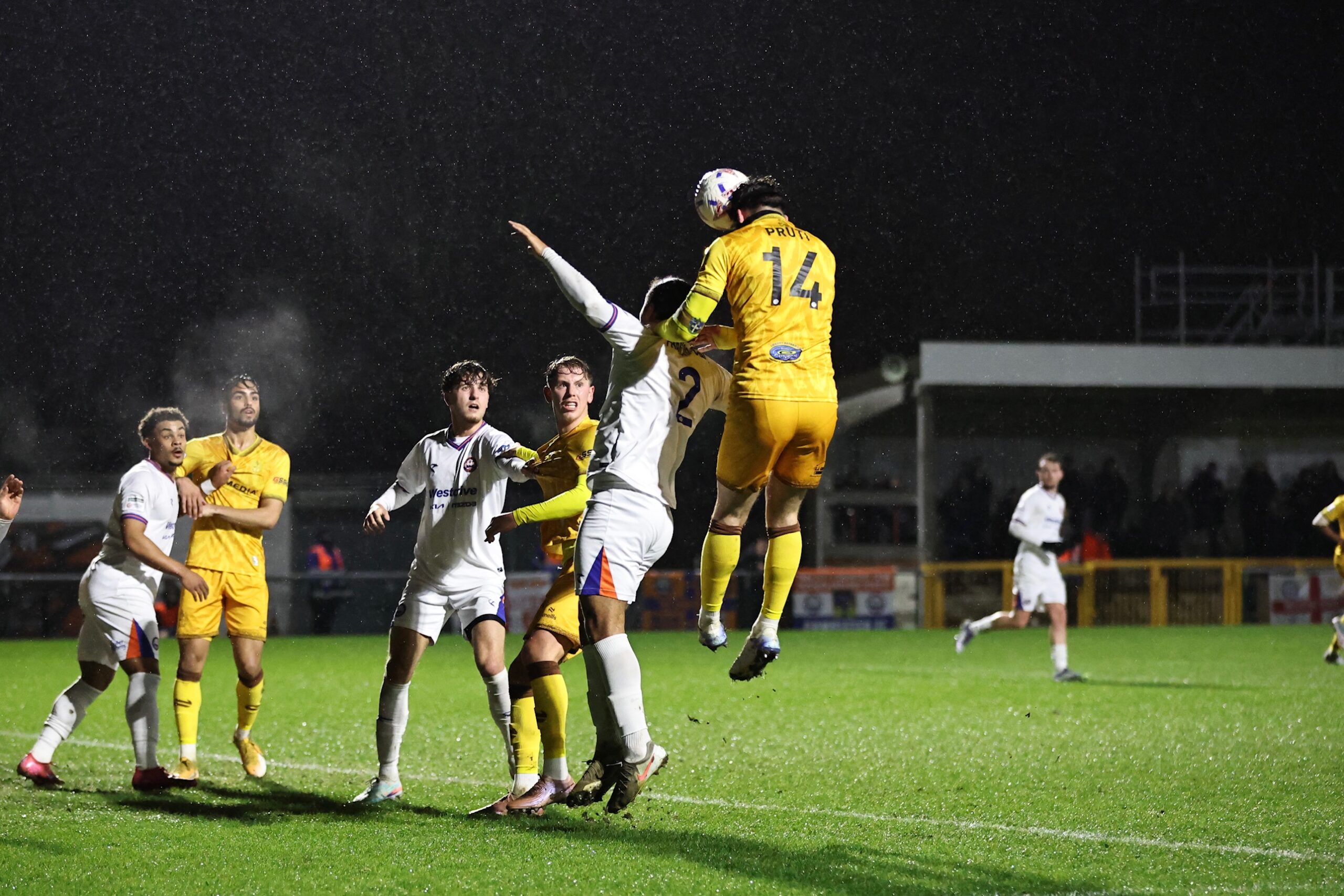 The chances that did come in the first half fell to U’s as Jack Sims enjoyed a quiet half against his former club. The first opening came as U’s defence survived a heart in mouth moment, almost conceding possession inside their own penalty area, to launch a flowing move that ended with Donkor’s cross being diverted for a corner, and Edon Pruti met Simper’s corner with a powerful header (below) that was pushed away by Mason Terry.